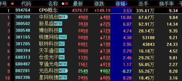 具體看,截至3月23日上午收盤,CPO概念板塊再度上行,漲幅居首達(dá)3.53%。其中,中際旭創(chuàng)漲幅超10%。