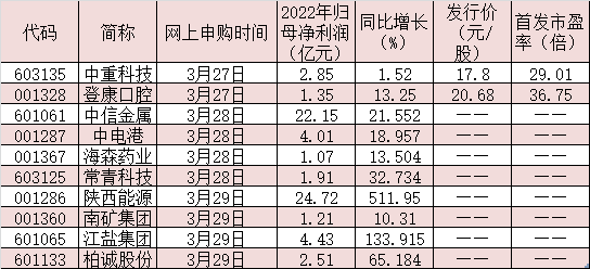 3月27日,首批滬深主板注冊(cè)制新股正式開始網(wǎng)上申購。首批10只滬深主板注冊(cè)制新股,中重科技、登康口腔在本周一(3月27日)申購;中電港、常青科技、中信金屬、海森藥業(yè)將在本周二(3月28日)申購;柏誠(chéng)股份、江鹽集團(tuán)、南礦集團(tuán)、陜西能源將在本周三(3月29日)申購。