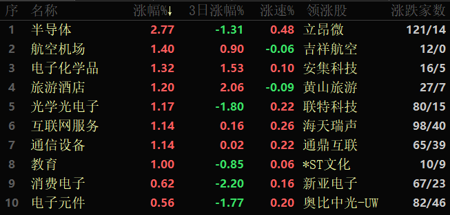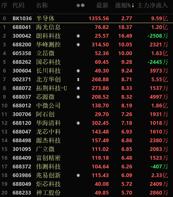 從早盤表現(xiàn)強勢的半導(dǎo)體行業(yè)看,該行業(yè)交易中的135只成份股中有121只上漲,其中,有23只個股漲幅超5%。資金方面,有9.59億元大單資金凈流入該行業(yè),居各行業(yè)資金凈流入排名第1位。