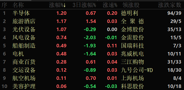 東方財(cái)富行業(yè)方面,截至3月30日11:30,86個(gè)行業(yè)板塊中11個(gè)上漲,占比12.78%,其中,半導(dǎo)體行業(yè)漲幅居前,達(dá)1.20%,此外,旅游酒店和光伏設(shè)備行業(yè)漲幅均超1%。下跌方面,通信服務(wù)跌幅居首,達(dá)2.13%;教育行業(yè)跌幅也超2%,達(dá)到2.10%。