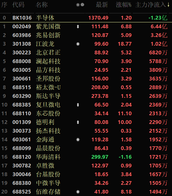 從早盤表現(xiàn)強(qiáng)勢(shì)的半導(dǎo)體行業(yè)看,該行業(yè)交易中的135只成份股中有94只上漲,其中,有12只個(gè)股漲幅超5%。資金方面,有1.23億元大單資金凈流出該行業(yè)。