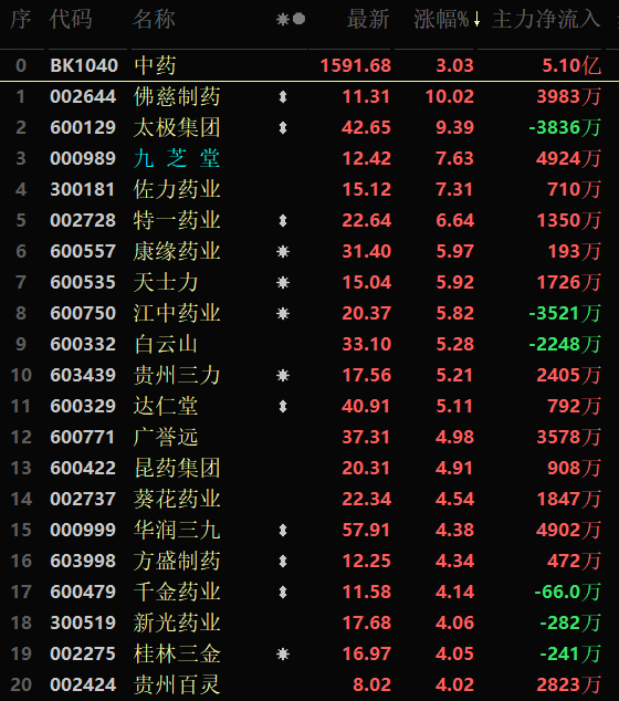 從早盤(pán)表現(xiàn)強(qiáng)勢(shì)的中藥行業(yè)看,該行業(yè)交易中的73只成分股中有70只上漲,其中,有11只個(gè)股漲幅超5%。資金方面,有5.10億元大單資金凈流入該行業(yè),居各行業(yè)第3位。
