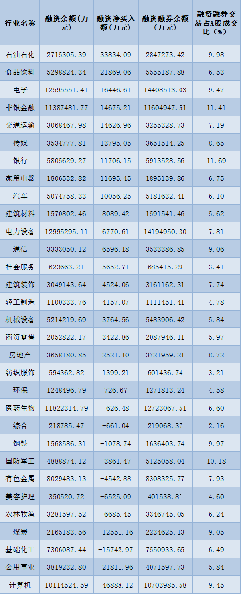 表:3月30日申萬(wàn)一級(jí)行業(yè)兩融交易情況: