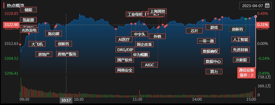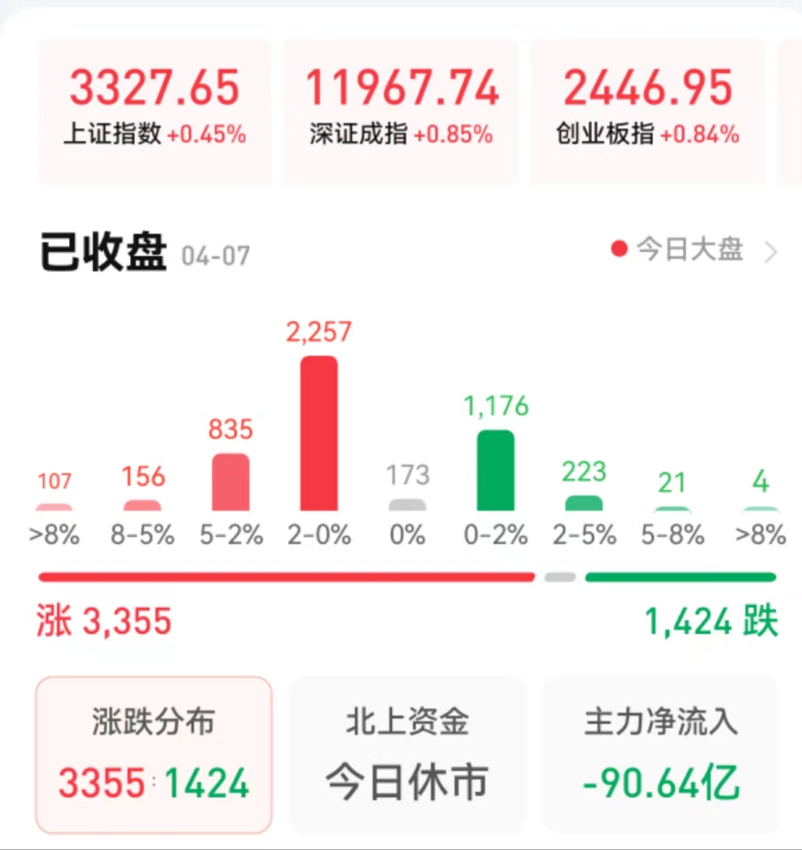 周五(4月7日),A股三大股指震蕩上行,全線飄紅。截至收盤(pán),上證指數(shù)漲0.45%報(bào)3327.65點(diǎn),實(shí)現(xiàn)六連陽(yáng);深證成指漲0.85%報(bào)11967.74點(diǎn),創(chuàng)業(yè)板指漲0.84%報(bào)2446.95點(diǎn),科創(chuàng)50指數(shù)漲1.23%;兩市合計(jì)成交金額達(dá)10540億元,連續(xù)第4個(gè)交易日突破萬(wàn)億元;總體來(lái)看,A股個(gè)股漲多跌少。其中,漲停個(gè)股達(dá)49只,跌停個(gè)股達(dá)5只。