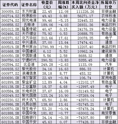 資金方面,本周北向資金累計(jì)凈流出30.72億元,其中滬股通資金凈流出17.87元,深股通資金凈流出12.85億元。從前十大成交活躍股來(lái)看,本周,東方財(cái)富、牧原股份等2只個(gè)股,北向資金凈買入金額均超5億元。另外,中國(guó)平安、招商銀行、中國(guó)中免等個(gè)股遭北向資金凈賣出金額均超6億元。
