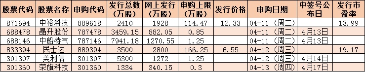 根據(jù)發(fā)行安排,下周(4月10日-14日)共有6只新股發(fā)行,其中科創(chuàng)板2只(晶升股份、中船特氣)、創(chuàng)業(yè)板2只(美利信、榮旗科技)、北交所2只(中??萍?、民士達(dá))。