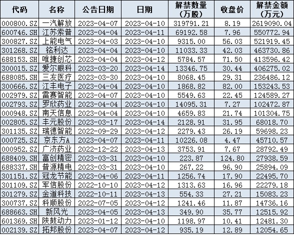 與此同時(shí),統(tǒng)計(jì)顯示,下周(4月10日-14日)共有53家公司限售股陸續(xù)解禁,按最新收盤(pán)價(jià)計(jì)算,解禁市值為618.34億元。從解禁市值來(lái)看,一汽解放(261.91億元)、江蘇索普(55.08億元)、上能電氣(52.19億元)等公司解禁金額均超50億元。
