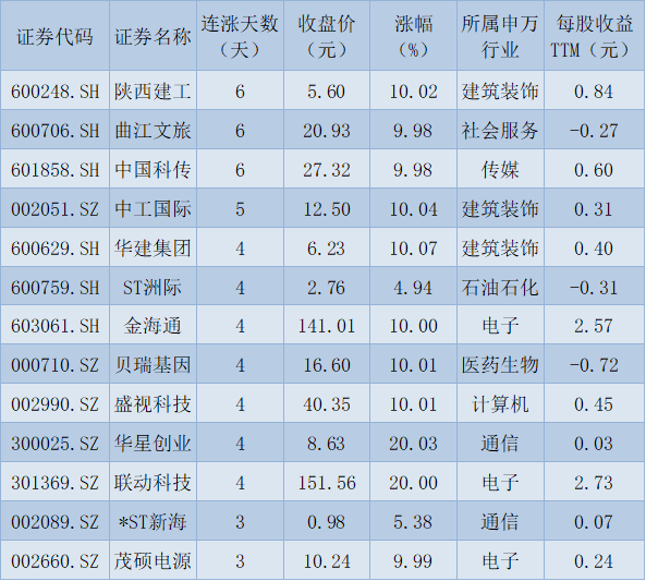 表:連續(xù)上漲2日且今日收盤(pán)漲停股一覽