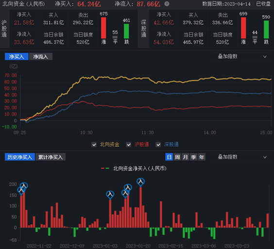 4月14日,A股三大指數(shù)震蕩上揚(yáng),集體收漲,滬指創(chuàng)年內(nèi)收盤(pán)新高,均線系統(tǒng)呈多頭排列,深證成指和創(chuàng)業(yè)板指在形態(tài)和均線排列上弱于滬指。截至收盤(pán),上證指數(shù)漲0.60%報(bào)3338.15點(diǎn);深證成指漲0.51%報(bào)11800.09點(diǎn),創(chuàng)業(yè)板指漲0.93%報(bào)2428.09點(diǎn),A股合計(jì)成交額11154.32億元,較前一交易日縮減1.93%;北向資金全天凈買入64.24億元;其中滬股通凈買入21.58億元,深股通凈買入42.66億元。今日A股漲多跌少,有2736只上漲,2183只下跌。