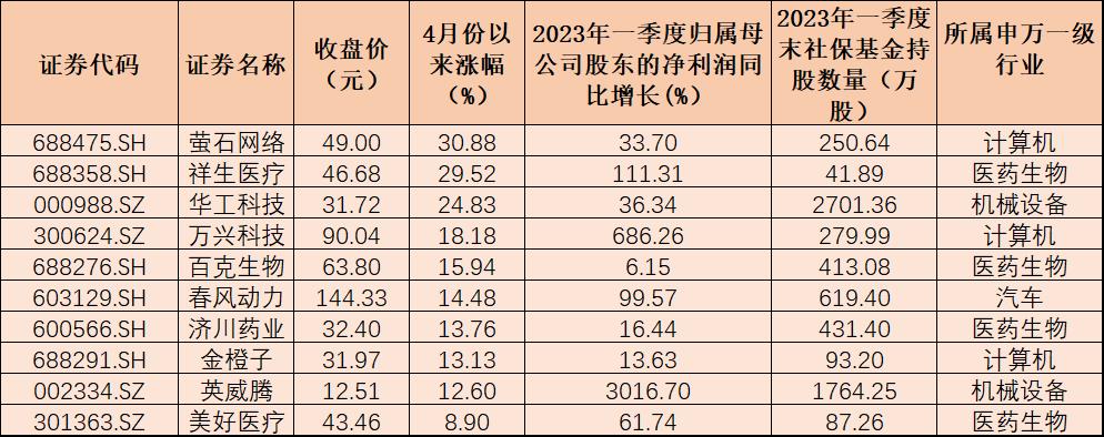隨著上市公司今年一季報(bào)的陸續(xù)披露,社?;鸬淖钚鲁謧}動(dòng)向也備受投資者關(guān)注。Choice數(shù)據(jù)顯示,截至4月19日16時(shí),A股市場(chǎng)中有174家上市公司發(fā)布了2023年一季報(bào),其中,有119家上市公司今年一季度凈利潤實(shí)現(xiàn)同比增長,占比68.39%。值得一提的是,在已披露的174家上市公司中,有27家公司前十大流通股股東名單中出現(xiàn)社?;鸬纳碛啊?/p>