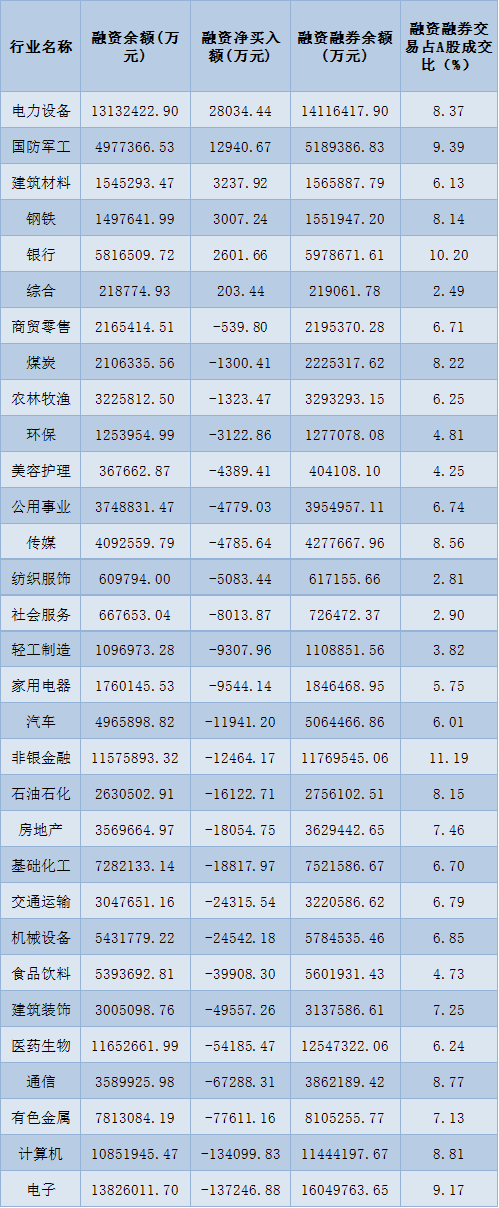 表:4月21日申萬(wàn)一級(jí)行業(yè)兩融交易情況: