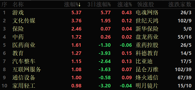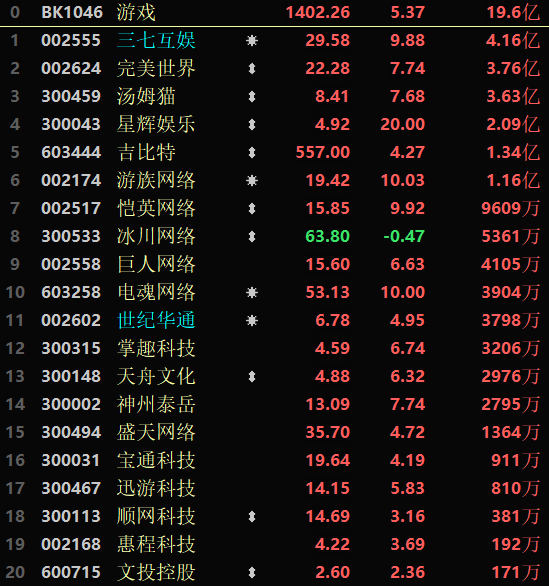 從早盤(pán)表現(xiàn)強(qiáng)勢(shì)的游戲行業(yè)看,交易中的29只成份股中26只上漲,其中,有13只個(gè)股漲幅超5%。資金方面,有19.6億元大單資金凈流入該行業(yè),居各行業(yè)第1位。