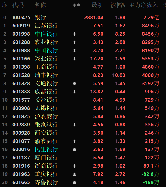 從早盤表現(xiàn)強(qiáng)勢的銀行行業(yè)看,交易中的42只成份股全線上漲,其中,有3只個(gè)股漲幅超5%。資金方面,有2.29億元大單資金凈流入該行業(yè),居各行業(yè)第2位。