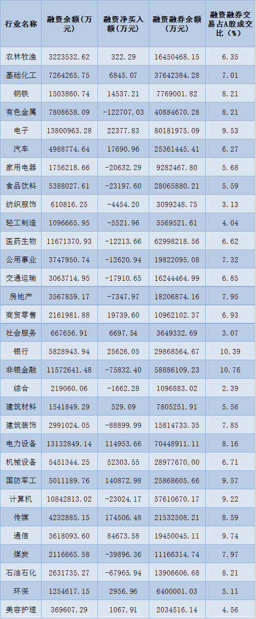 表:4月24日申萬一級(jí)行業(yè)兩融交易情況:
