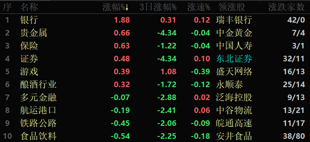 東方財(cái)富行業(yè)方面,截至4月25日11:30,86個(gè)行業(yè)板塊中6個(gè)上漲,占比6.98%,其中,銀行行業(yè)漲幅居前,達(dá)1.88%。下跌方面,能源金屬行業(yè)跌幅居首,達(dá)6.53%,此外,包括電池、工程咨詢服務(wù)和旅游酒店等在內(nèi)的12個(gè)行業(yè)跌幅超3%。