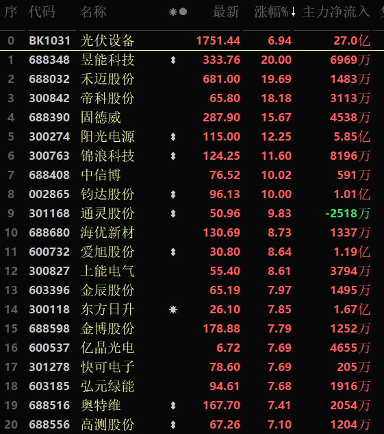 從早盤表現(xiàn)強(qiáng)勢的光伏設(shè)備行業(yè)看,交易中的48只成份股中有47只上漲,其中,有30只個(gè)股漲幅超5%。資金方面,有27億元大單資金凈流入該行業(yè),居各行業(yè)第1位。