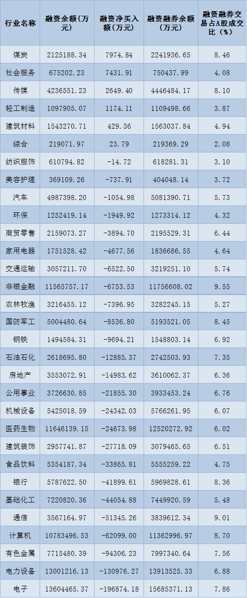 表:4月25日申萬一級(jí)行業(yè)兩融交易情況: