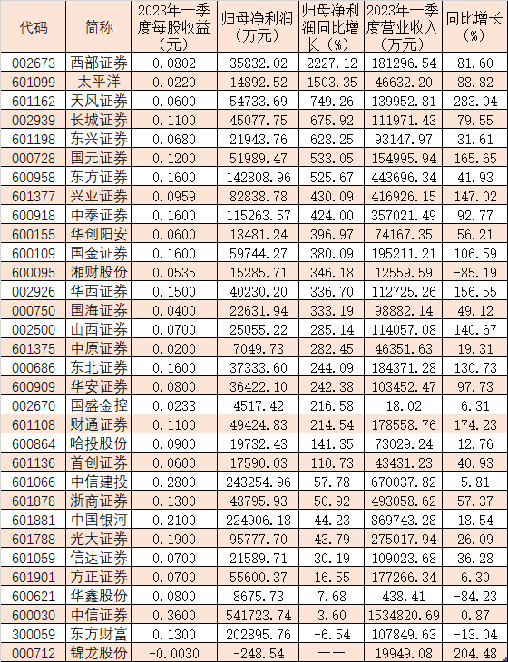 同花順數(shù)據(jù)顯示,截至4月28日,已有32家上市券商披露了2023年一季度業(yè)績,30家券商報告期內(nèi)實現(xiàn)歸母凈利潤同比增長,占比93.75%。其中,22家券商報告期內(nèi)實現(xiàn)歸母凈利潤同比翻番。