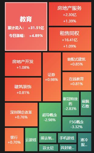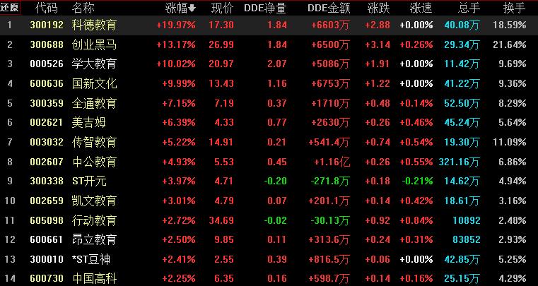 具體看,截至5月5日上午收盤,教育板塊漲幅居首達4.89%。其中,科德教育20CM漲停,創(chuàng)業(yè)黑馬、學大教育、國新文化等多只概念股漲幅均超9%。