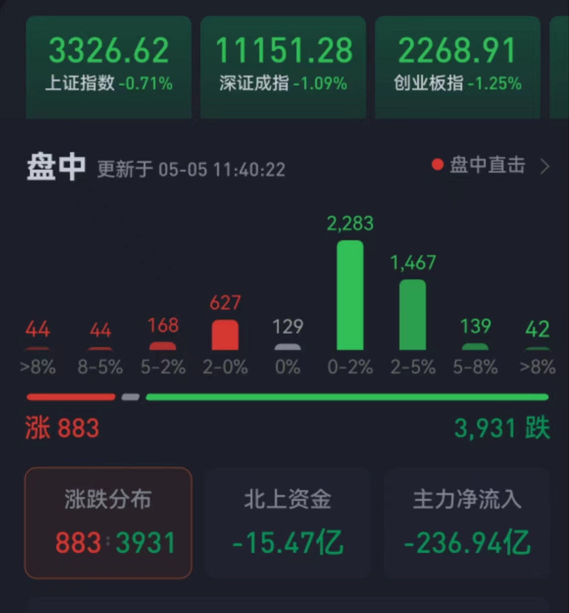 周五(5月5日),三大股指震蕩回落。截至上午收盤,上證指數(shù)跌幅達0.71%,報3326.62點;深證成指和創(chuàng)業(yè)板指跌幅分別為1.09%和1.25%;滬深兩市合計成交額7222.9億元,總體來看,兩市個股跌多漲少。