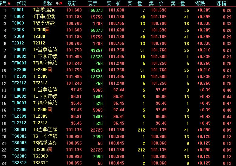 周五,國(guó)債期貨繼續(xù)全線收漲,30年期主力合約漲0.40%,再創(chuàng)新高,10年期主力合約漲0.28%,5年期主力合約漲0.21%,2年期主力合約漲0.09%。