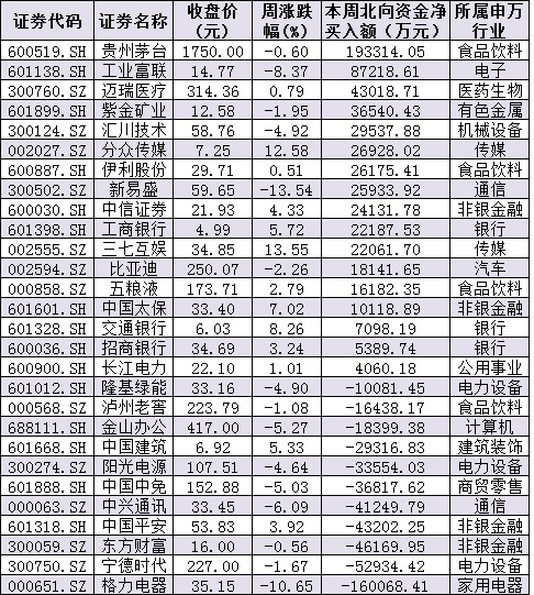 資金方面,本周北向資金累計(jì)凈賣(mài)出金額達(dá)8.06億元。從前十大成交活躍股來(lái)看,本周,貴州茅臺(tái)、工業(yè)富聯(lián)等2只個(gè)股,北向資金凈買(mǎi)入金額均超8億元。另外,格力電器、寧德時(shí)代等個(gè)股遭北向資金凈賣(mài)出金額均超5億元。