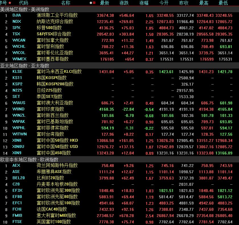 周五,美國(guó)三大股指全線收漲,道指漲1.65%報(bào)33674.38點(diǎn),標(biāo)普500指數(shù)漲1.85%報(bào)4136.25點(diǎn),納指漲2.25%報(bào)12235.41點(diǎn)。本周,道指跌1.24%,標(biāo)普500指數(shù)跌0.8%,納指漲0.07%。