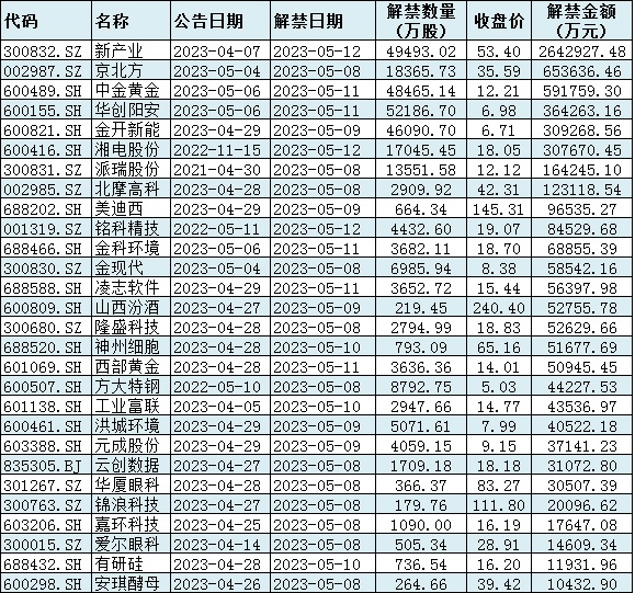 與此同時(shí),統(tǒng)計(jì)顯示,下周(5月8日-12日)共有75家公司限售股陸續(xù)解禁,按最新收盤(pán)價(jià)計(jì)算,解禁市值為616.57億元。從解禁市值來(lái)看,新產(chǎn)業(yè)(264.29億元)、京北方(65.36億元)、中金黃金(59.18億元)等公司解禁金額均超50億元。
