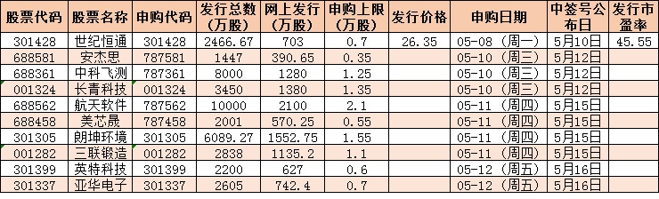 根據(jù)發(fā)行安排,下周(5月8日-12日)有10只新股發(fā)行。具體來(lái)看,周一1只,世紀(jì)恒通;周三3只,安杰思、中科飛測(cè)、長(zhǎng)青科技;周四4只,航天軟件、美芯晟、朗坤環(huán)境、三聯(lián)鍛造;周五2只,英特科技、亞華電子。
