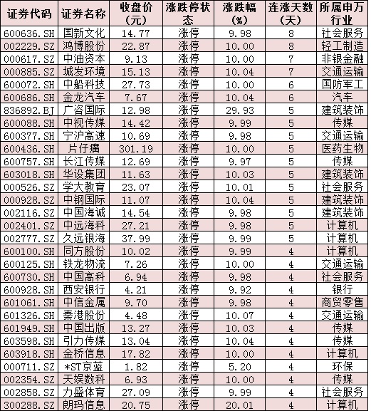 表:連續(xù)上漲4日且今日收盤漲停個(gè)股情況: