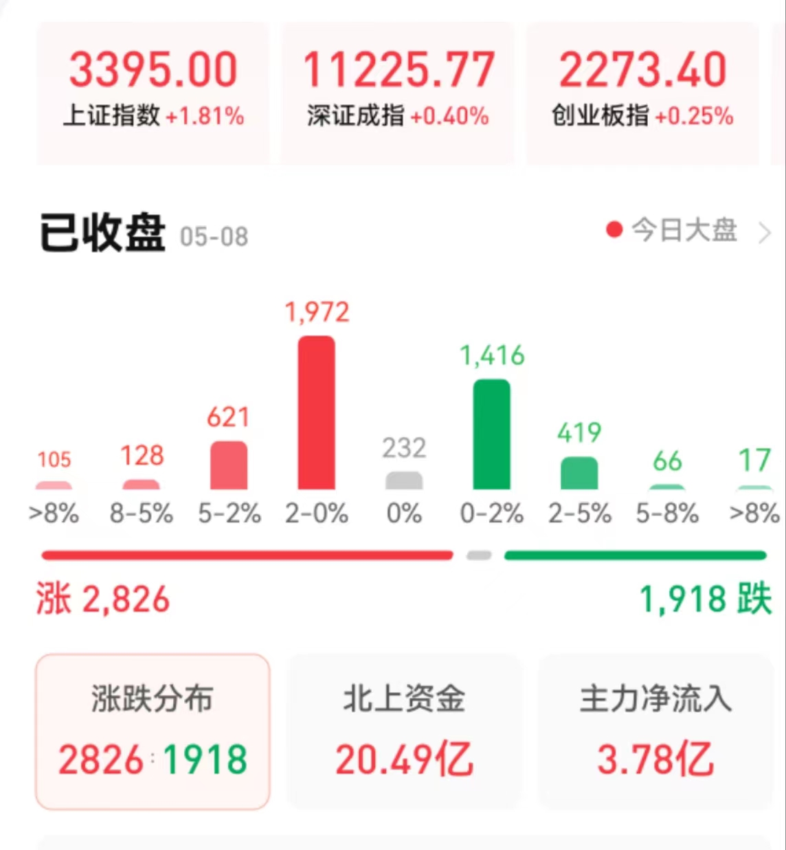 周一(5月8日),A股三大股指震蕩上行,全線飄紅。截至收盤,上證指數(shù)漲1.81%報(bào)3395點(diǎn),深證成指漲0.4%報(bào)11225.77點(diǎn),創(chuàng)業(yè)板指漲0.25%報(bào)2273.4點(diǎn);兩市合計(jì)成交金額11369億元,連續(xù)第22個(gè)交易日突破萬(wàn)億元。北向資金凈買入20.49億元。總體上看,兩市個(gè)股漲多跌少。其中,漲停個(gè)股達(dá)62只,跌停個(gè)股達(dá)51只。