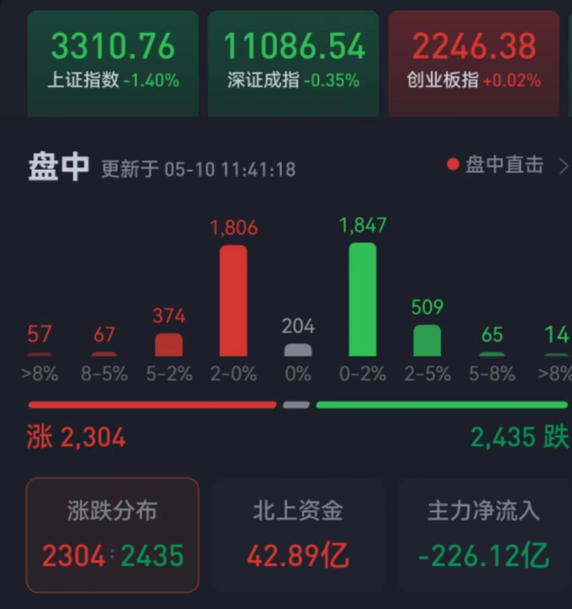 周三(5月10日),A股三大股指震蕩分化,漲跌不一。截至上午收盤,上證指數(shù)跌幅達(dá)1.40%,報(bào)3310.76點(diǎn);深證成指跌幅達(dá)0.35%,創(chuàng)業(yè)板指漲幅為0.02%;滬深兩市合計(jì)成交額6453.2億元,總體來看,兩市個(gè)股跌多漲少。