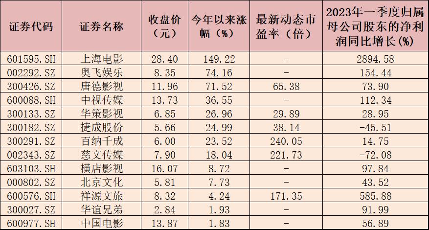 基本面的改善也促進股價的上漲。今年以來,截至5月25日收盤,影視院線板塊期間累計上漲11.82%,大幅跑贏同期上證指數(上漲3.63%),板塊內22只個股中有13只個股期間實現上漲,占比近六成,其中,上海電影、奧飛娛樂、唐德影視、中視傳媒、華策影視期間累計漲幅居前五,均漲超26%。