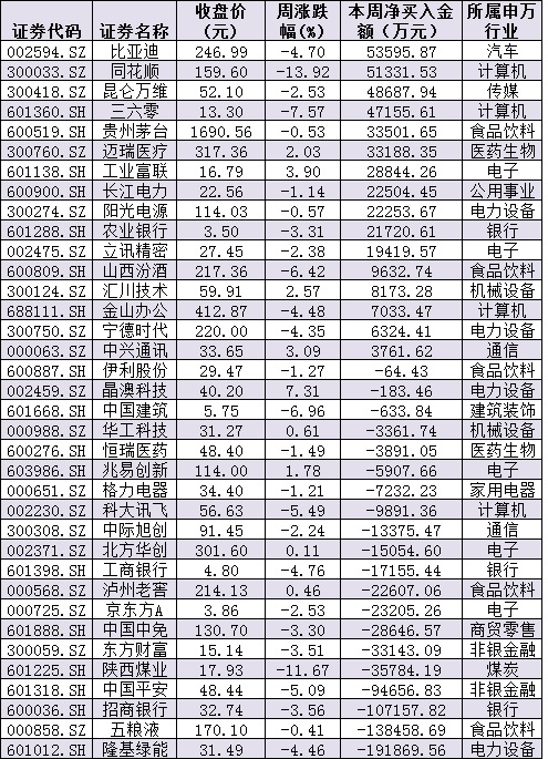 資金方面,本周北向資金累計(jì)凈賣(mài)出金額達(dá)178.88億元,其中滬股通凈賣(mài)出58.88億元,深股通凈賣(mài)出120億元。從前十大成交活躍股來(lái)看,本周,比亞迪、同花順等2只個(gè)股,北向資金凈買(mǎi)入金額均超5億元。另外,隆基綠能、五糧液、招商銀行等個(gè)股遭北向資金凈賣(mài)出金額均超10億元。