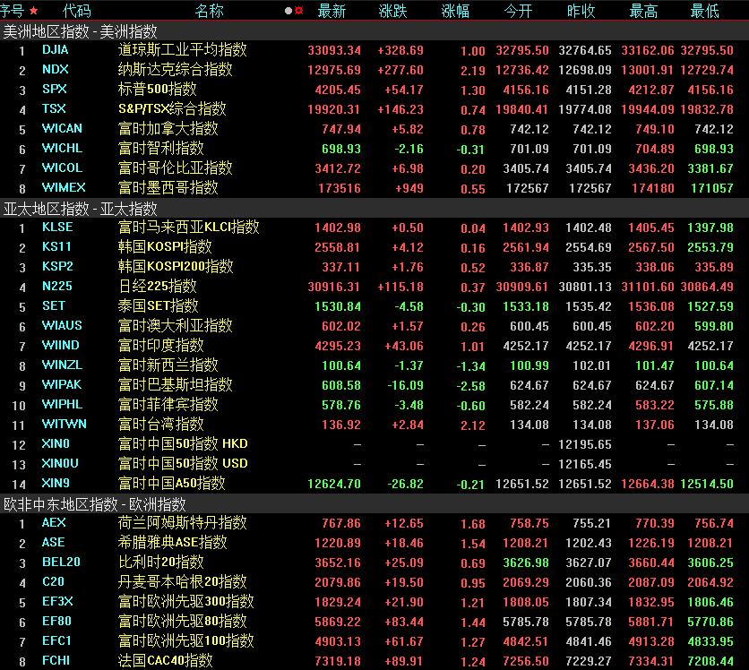 周五,美國(guó)三大股指全線(xiàn)收漲,道指漲1%報(bào)33093.34點(diǎn),標(biāo)普500指數(shù)漲1.3%報(bào)4205.45點(diǎn),納指漲2.19%報(bào)12975.69點(diǎn)。本周,道指跌1%,標(biāo)普500指數(shù)漲0.32%,納指漲2.51%。