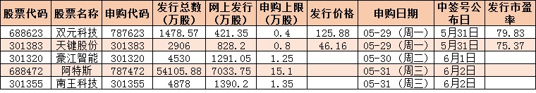 根據(jù)發(fā)行安排,已公布的信息顯示,下周(5月29日—6月2日)有5只新股發(fā)行,其中,創(chuàng)業(yè)板公司有3家,科創(chuàng)板公司有2家。