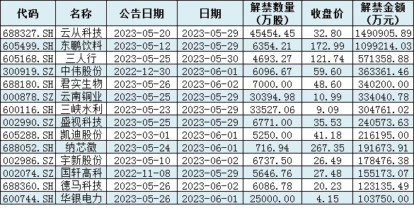 與此同時(shí),統(tǒng)計(jì)顯示,下周(5月29日-6月2日)共有75家公司限售股陸續(xù)解禁,按最新收盤(pán)價(jià)計(jì)算,解禁市值為627.95億元。從解禁市值來(lái)看,云從科技-UW(149.09億元)、東鵬飲料(109.92億元)等公司解禁金額均超100億元。