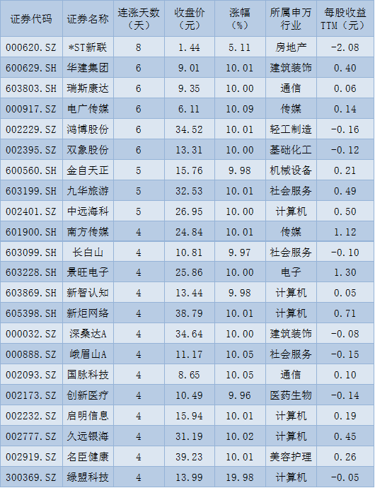 表:連續(xù)上漲4日且今日收盤漲停股一覽