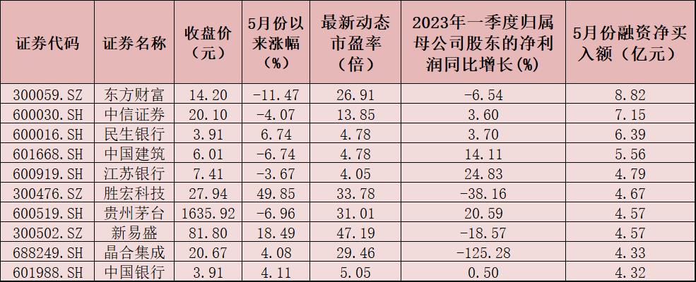 表:5月份融資凈買入額排名前十個(gè)股一覽