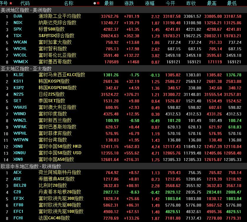 周五,美國三大股指全線收漲,道指漲2.12%報33762.76點,標(biāo)普500指數(shù)漲1.45%報4282.37點,納指漲1.07%報13240.77點。本周,道指漲2.02%,標(biāo)普500指數(shù)漲1.83%,納指漲2.04%。