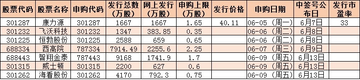 根據(jù)發(fā)行安排,下周將有7只新股申購,周一可申購康力源,周二可申購恒勃股份、飛沃科技、周三可申購西高院,周五可申購??垂煞荨⑼款D、智翔金泰。