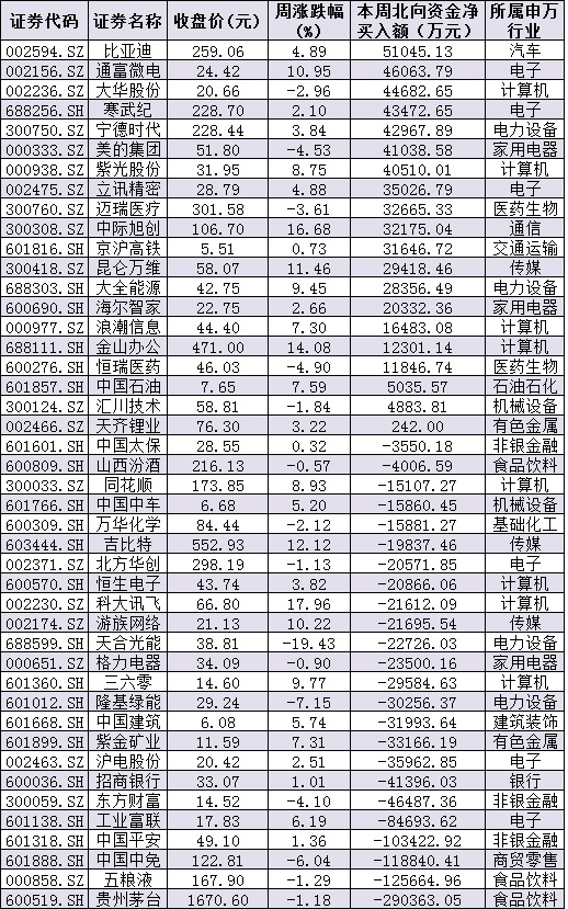 資金方面,周五,北上資金大幅凈買入85.34億元,創(chuàng)4個月來最大單日凈買入。本周北向資金累計凈買入金額達(dá)50.21億元。從前十大成交活躍股來看,本周,比亞迪、通富微電、大華股份、寒武紀(jì)、寧德時代、美的集團(tuán)、紫光股份等個股,北向資金凈買入金額均超4億元。另外,貴州茅臺、五糧液、中國中免、中國平安等個股遭北向資金凈賣出金額均超10億元。