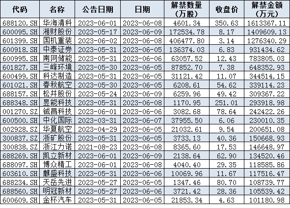 表:下周解禁金額超10億元的公司情況