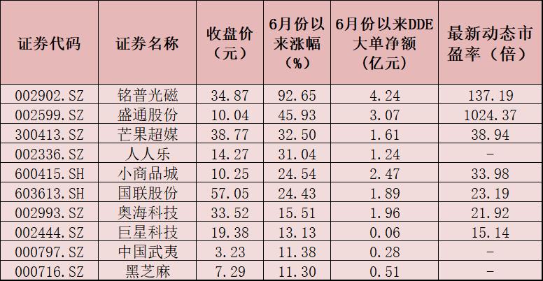 表:6月份以來大單資金買入額居前十的跨境電商概念股一覽