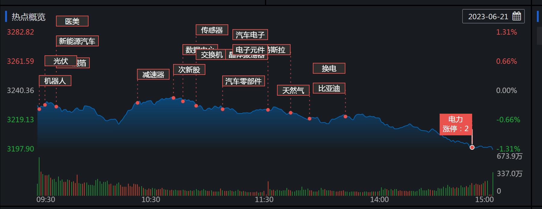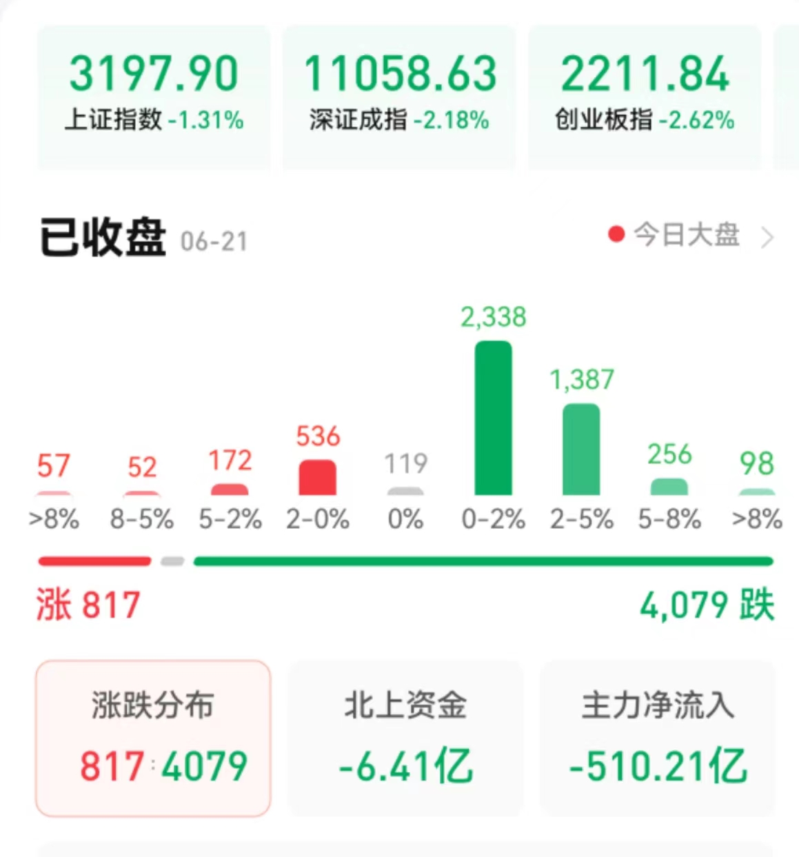 周三(6月21日),A股三大股指震蕩回落,全線飄綠。截至收盤,上證指數(shù)跌1.31%,報(bào)3197.9點(diǎn);深證成指跌2.18%,報(bào)11058.63點(diǎn);創(chuàng)業(yè)板指跌2.62%,報(bào)2211.84點(diǎn)。兩市合計(jì)成交金額10219億元,連續(xù)第6個(gè)交易日突破萬(wàn)億元。北向資金凈賣出6.41億元??傮w上看,兩市個(gè)股跌多漲少,超4000只個(gè)股下跌,其中,漲停個(gè)股達(dá)47只,跌停個(gè)股達(dá)20只。