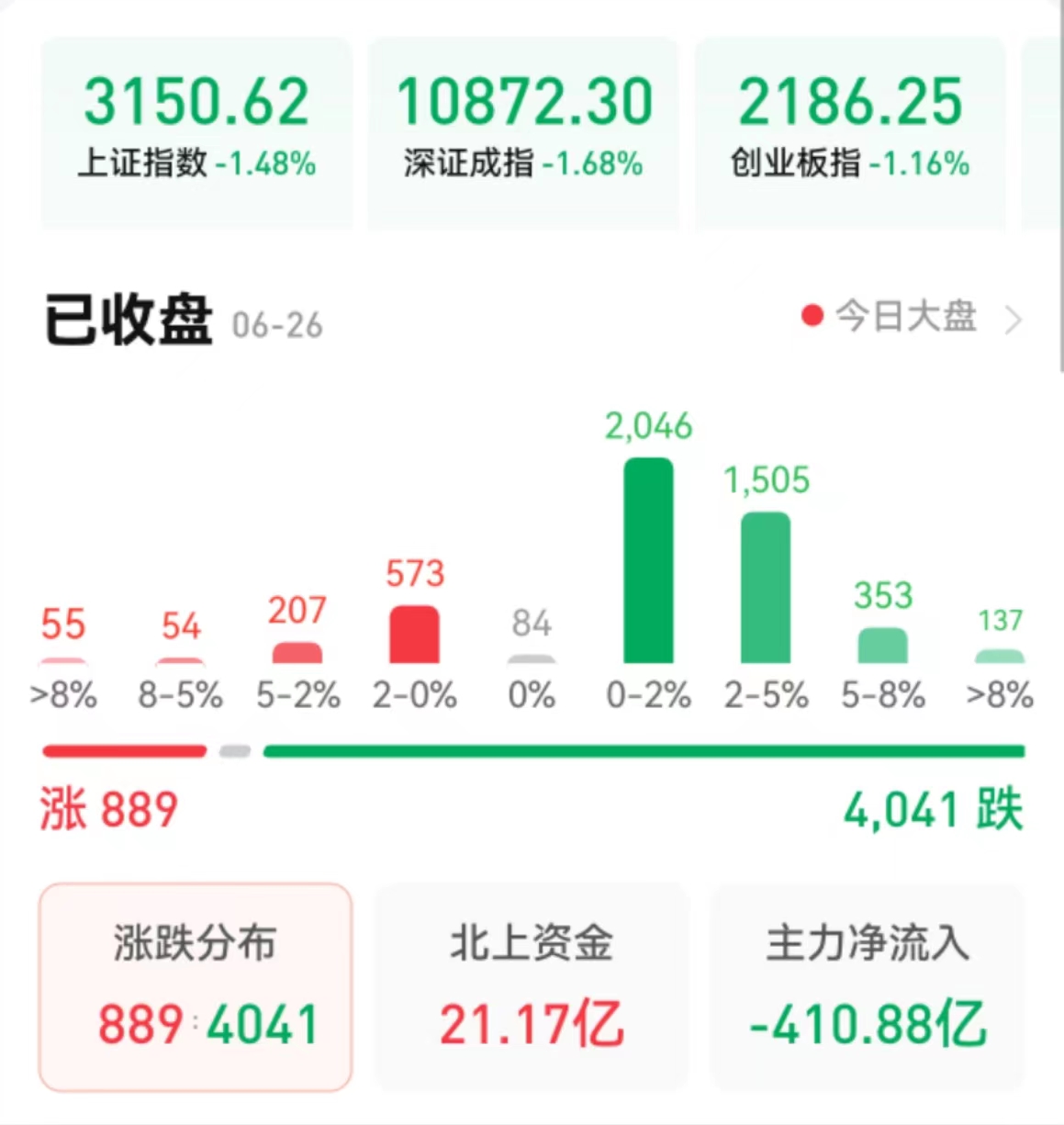 周一(6月26日),A股三大指數(shù)震蕩下行,全線下跌。截至收盤,上證指數(shù)跌1.48%報(bào)3150.62點(diǎn),深證成指跌1.68%報(bào)10872.3點(diǎn),創(chuàng)業(yè)板指跌1.16%報(bào)2186.25點(diǎn);兩市合計(jì)成交額達(dá)9773億元,北向資金凈買入21.17億元。總體上看,兩市個(gè)股跌多漲少,下跌個(gè)股超4000只,其中,漲停個(gè)股達(dá)46只,跌停個(gè)股達(dá)31只。