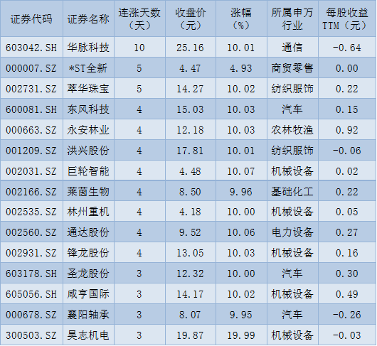 表:連續(xù)上漲3日且今日收盤漲停股一覽