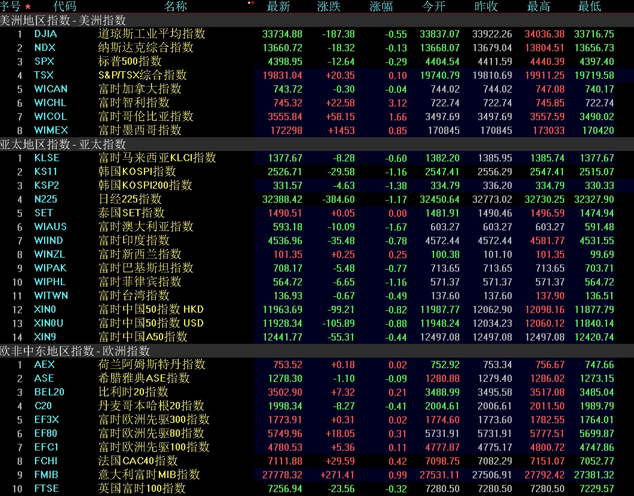 周五,美國(guó)三大股指全線(xiàn)收跌,道指跌0.55%報(bào)33734.88點(diǎn),標(biāo)普500指數(shù)跌0.29%報(bào)4398.95點(diǎn),納指跌0.13%報(bào)13660.72點(diǎn)。本周,道指跌1.96%,標(biāo)普500指數(shù)跌1.16%,納指跌0.92%。