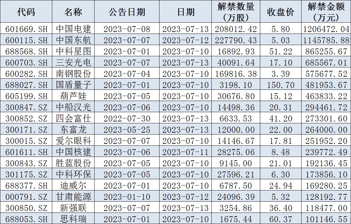 與此同時(shí),據(jù)同花順統(tǒng)計(jì)顯示,下周(7月10日-14日)共有87家公司限售股陸續(xù)解禁,按最新收盤(pán)價(jià)計(jì)算,解禁市值為878.57億元。從解禁市值來(lái)看,中國(guó)電建(120.65億元)、中國(guó)東航(114.58億元)等公司解禁金額均超100億元。