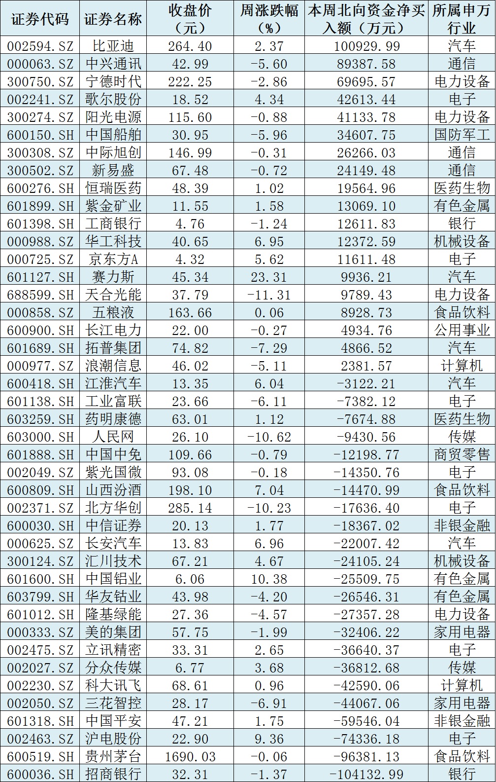 資金方面,本周北向資金累計(jì)凈賣(mài)出金額達(dá)91.6億元。從前十大成交活躍股來(lái)看,本周,比亞迪、中興通訊、寧德時(shí)代等3只個(gè)股,北向資金凈買(mǎi)入金額均超6億元。另外,招商銀行、貴州茅臺(tái)、滬電股份等個(gè)股遭北向資金凈賣(mài)出金額均超7億元。